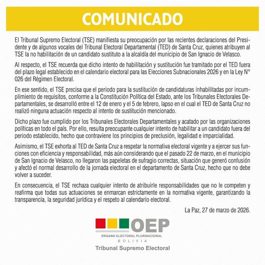«La sala plena ha emitido la Resolución Número 138 /2026, en la cual realiza la convocatoria a elecciones de autoridades departamentales 2026, segunda vuelta, y las actividades del calendario electoral», detalló la autoridad.